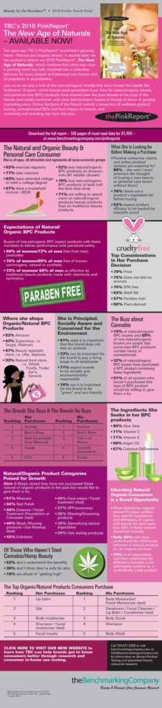 Interest in natural and organic cosmetics, skincare and hair care products have grown stronger in recent years. This infographic is a prelude to The Benchmarking Company’s PinkReport™: The New Age of Naturals. It includes details on what consumers expect from the organic/natural cosmetics label, giving brands better insight into how to market beauty products to appeal to this user base. At the top of the list is no animal testing. Eighty-one percent (81%) of respondents confirmed they value brands that don’t test on animals. However, that is far from the only concern for consumers, who are also interested in the health and environmental impact of a natural or organic lifestyle, as well as the social impact of the products they purchase.