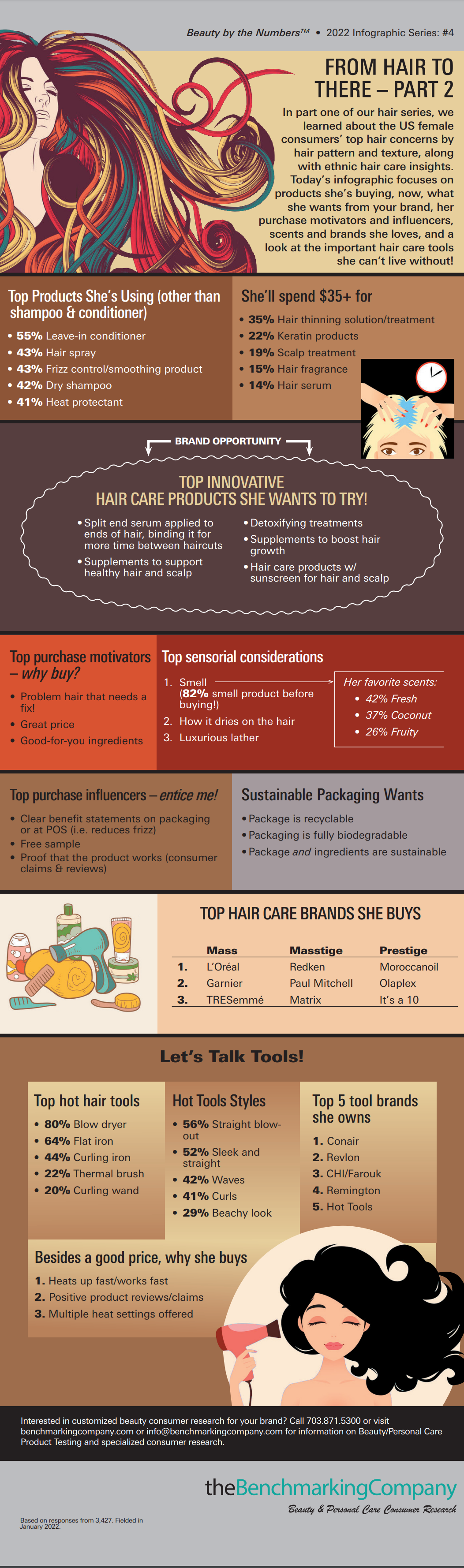 In part one of our hair series, we learned about the US female consumers’ top hair concerns by hair pattern and texture, along with ethnic hair care insights. Today’s infographic focuses on products she’s buying, now, what she wants from your brand, her purchase motivators and influencers, scents and brands she loves, and a look at the important hair care tools she can’t live without!