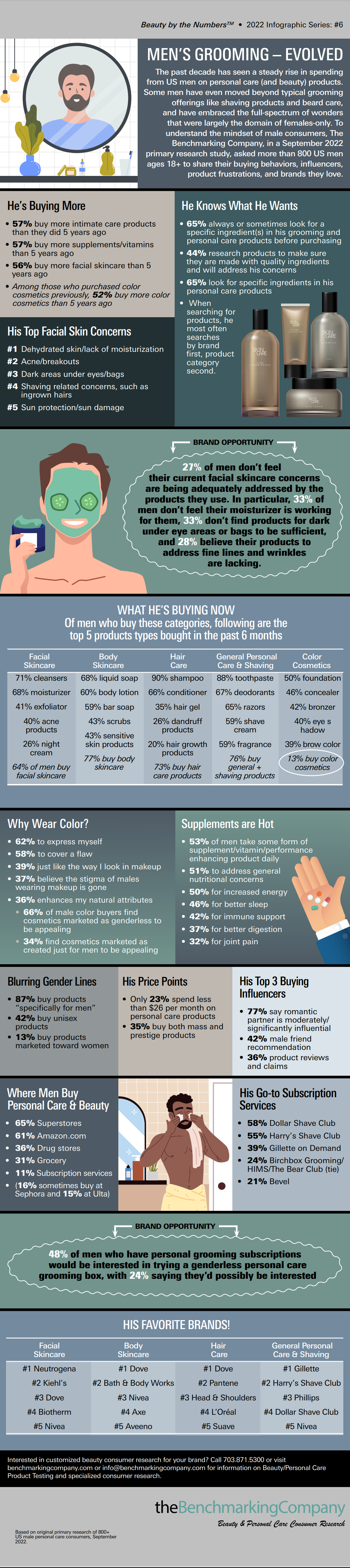 The past decade has seen a steady rise in spending from Us men on personal care (and beauty) products. Some men have even moved beyond typical grooming offerings like shaving products and beard care and have embraced the full-spectrum of wonders that were largely the domain or females-only. To understand the mindset of male consumers, The Benchmarking Company, in a September 2022 primary research study, asked more than 800 US men ages 18+ to share their buying behaviors, influencers product frustrations, and brands they love.