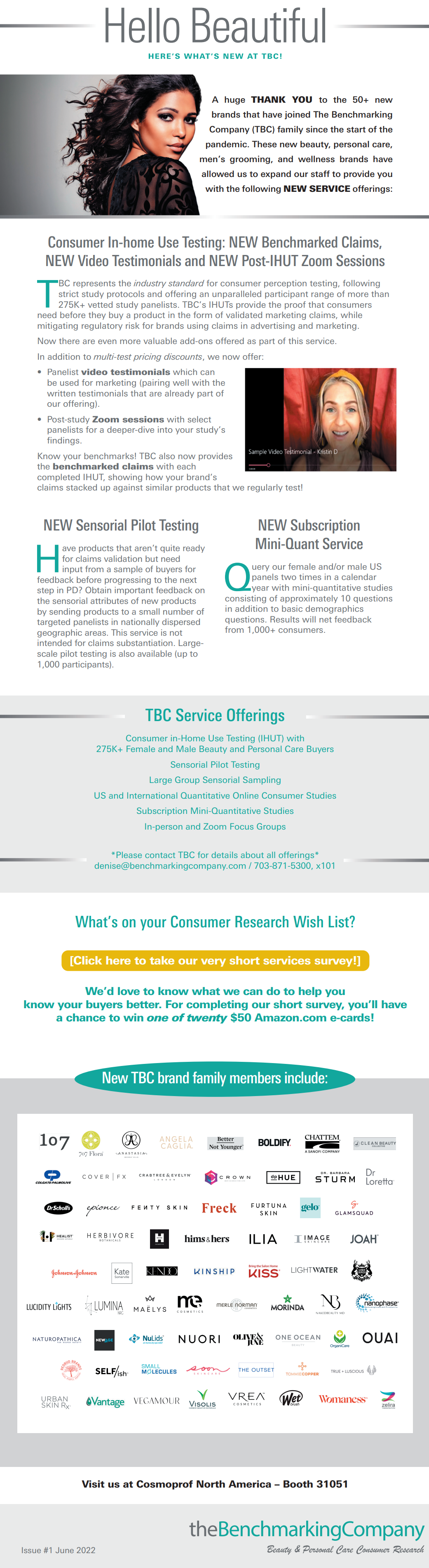 A huge THANK YOU to the 50+ new brands that have joined The Benchmarking Company (TBC) family since the start of the pandemic. These new beauty, personal care, men’s grooming, and wellness brands have allowed us to expand our staff to provide you with the following NEW SERVICE offerings:
