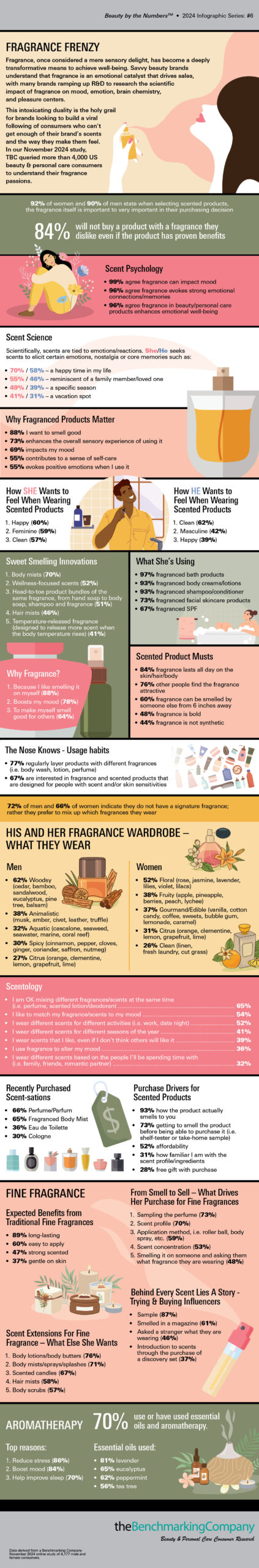 This intoxicating duality is the holy grail for brands looking to build a viral following of consumers who can’t get enough of their brand’s scents and the way they make them feel. In our November 2024 study, TBC queried more than 4,000 US beauty & personal care consumers to understand their fragrance passions.