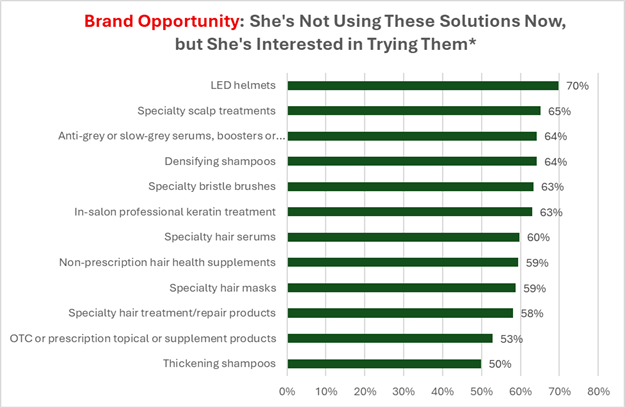 There are many solutions that she’s interested in trying, but she just hasn’t done so yet. Seventy percent (70%) of menopausal women said they’re interested in using an LED hair growth helmet that uses low-level red-light therapy to stimulate hair follicles. Specialty scalp treatments (65%), anti-grey boosters or supplements (64%), densifying shampoos (64%), specialty bristle brushes (63%), and keratin treatments (63%) are also of strong interest.