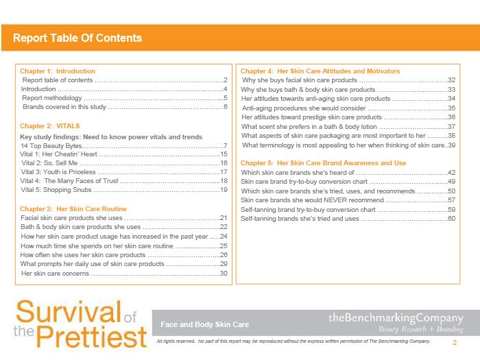 Survival of the Prettiest – Face and Body Skin Care presents a comprehensive and fascinating look at what women want in skin care products, what they’ll buy and why. This Pink Report™ will help you develop products that will support and delight her by knowing what triggers her beauty buying habits, what’s happening in her personal life, and how she intimately connects with the concept of beauty and with people
