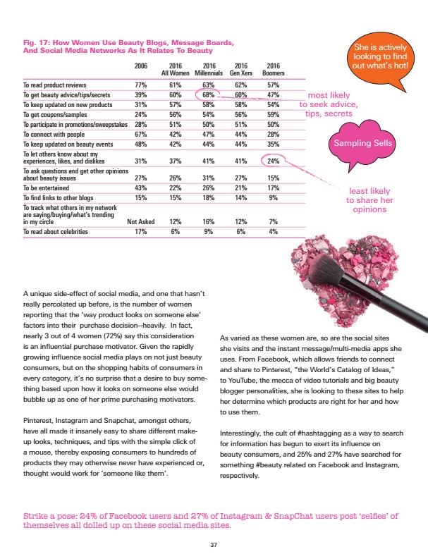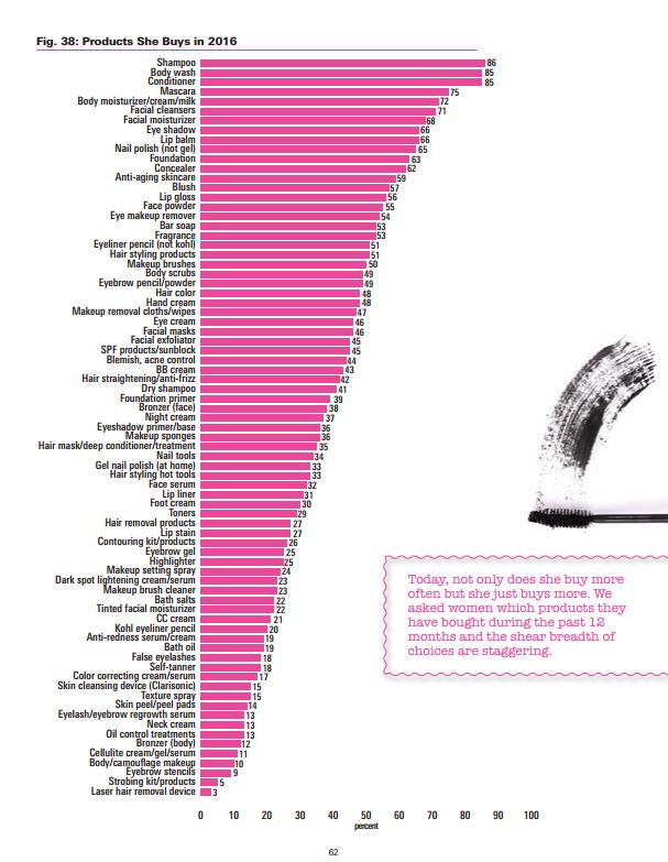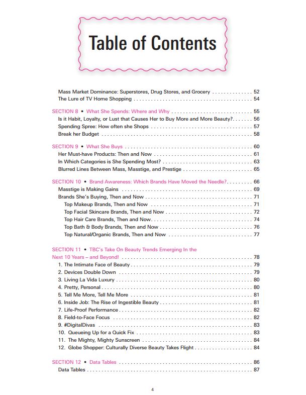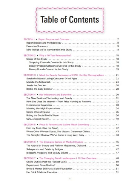 This 170-page report, created from survey data captured from 6,212 females (and then benchmarked against similar questions posed in 2006) shows how, when and why she shops now, which brands have moved the needle the most from 2006 to 2016, her price points and influencers, and what’s on her beauty horizon (that you need to know about) for the next 10 years!